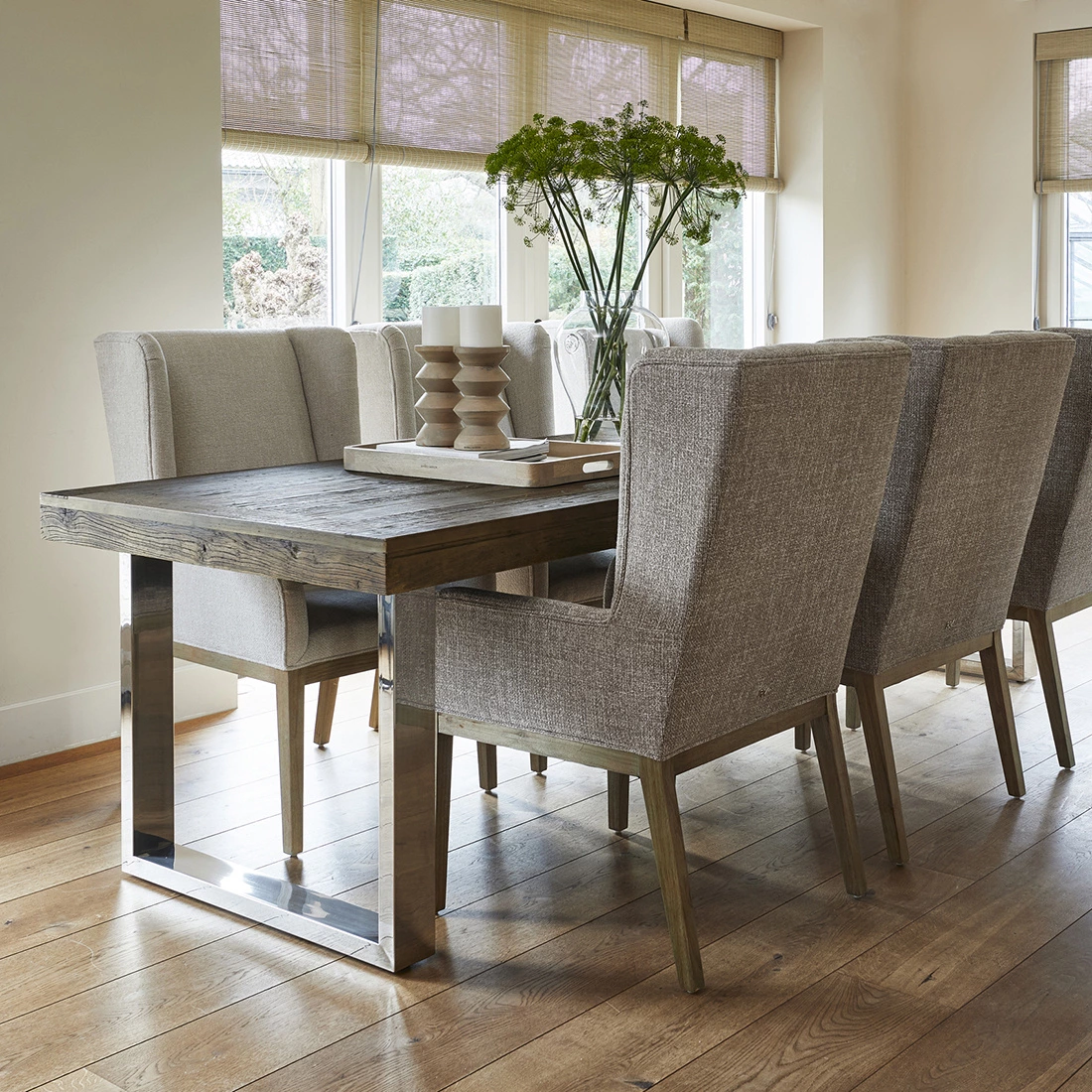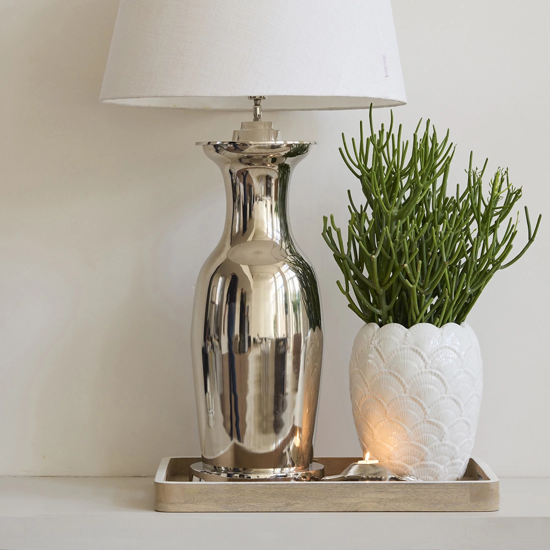 Style bakken på sofabordet med en bog, en vase, en plante og en lysestage. Bakken er lavet i mango træ og er med hvid kant.