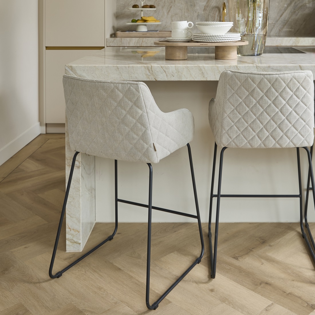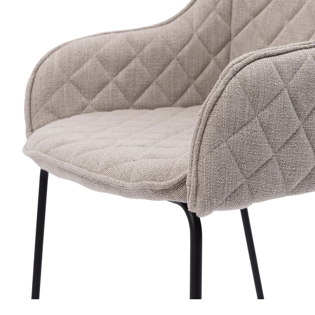 Det quiltede sæde i den varme FabFlax nuance tilfører både struktur og blødhed, mens de slanke, sorte metalben giver et let og stilrent look. Kombinationen skaber en fin balance mellem det elegante og det afslappede – perfekt til både hverdagsbrug og hyggelige stunder.